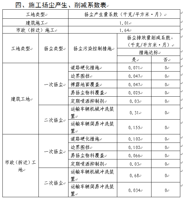 施工工地必须采取道路硬化措施、边界围挡、裸露地面(含土方)覆盖、易扬尘物料覆盖、持续洒水降尘、运输车辆冲洗装置等措施,并按控制措施达标与否,扣除削减量。