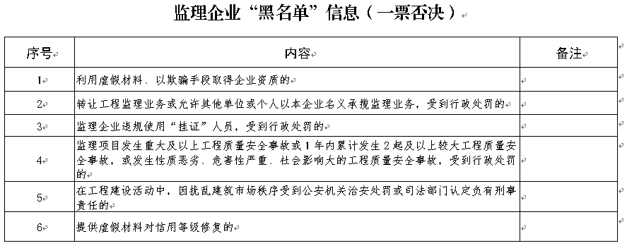 第十条【评价方式】信用分值采用量化打分制,实行动态评价,评价结果实时更新,信用等级报告可随时查询、打印。计算公式为:信用分值=基本信息分60分+优良信用信息分(满分40分)-不良信用信息分。具体计分标准见附件1、附件2、附件3。“黑名单”信息为一票否决项,有“黑名单”信息的监理企业,直接定为最低等级。具体“黑名单”信息见附件4。
