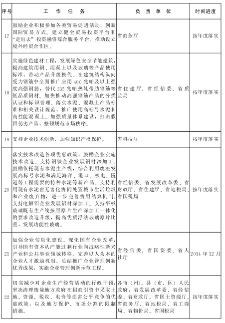 1.继续做好淘汰落后产能工作。2015年底以前,全省水泥、平板玻璃行业必须全部淘汰《产业结构调整指导目录(2011年本)(修正)》和《部分工业行业淘汰落后生产工艺装备和产品指导目录(2010年本)》中的落后生产工艺、装备和产品,淘汰水泥(熟料及粉磨)产能500万吨,普通平板玻璃产能500万重量箱。到2017年,再淘汰水泥(熟料及粉磨)产能500万吨,普通平板玻璃产能500万重量箱。各市(州)人民政府要将淘汰落后产能任务落实到具体企业,明确淘汰时限和相关责任人。