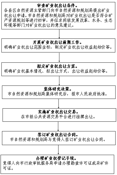 (三)试行矿业权出让竞买申请制度。为及时了解市场需求,试行矿业权出让竞买申请制度。各县区依照地热资源矿业权年度出让计划、市场需求等,及时在政府官网、县级新闻媒体等发布矿业权出让计划。有意向的竞买人可向各县区自然资源主管部门提出竞买申请,竞买申请要写明意向竞买矿业权编号、位置、面积等信息,并就参加意向竞买矿业权公开出让活动、地热资源勘查开发、助推乡村振兴、城市地质问题治理等作出承诺。(牵头单位:市自然资源和规划局)